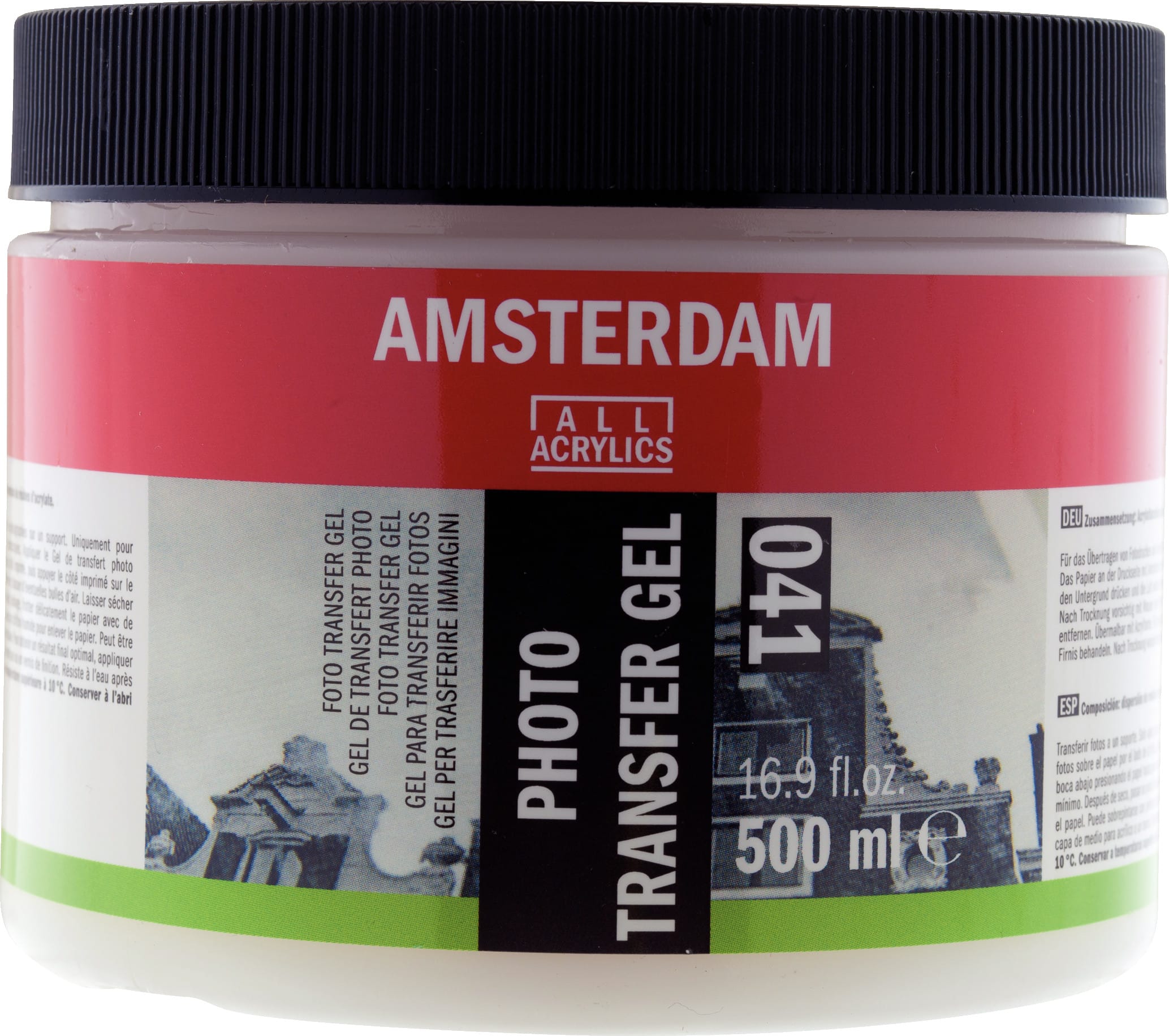 Yüksek kaliteli bir fotoğraf transfer jeli sunan Amsterdam Photo Transfer Gel 041, fotoğrafları veya baskıları tuval, ahşap, kağıt ve birçok yüzeye aktarmak için mükemmel bir yardımcı malzemedir. Bu jel, görüntüleri ters çevirerek aktarır ve eserlerinize karışık medya teknikleriyle özgün bir dokunuş katar.